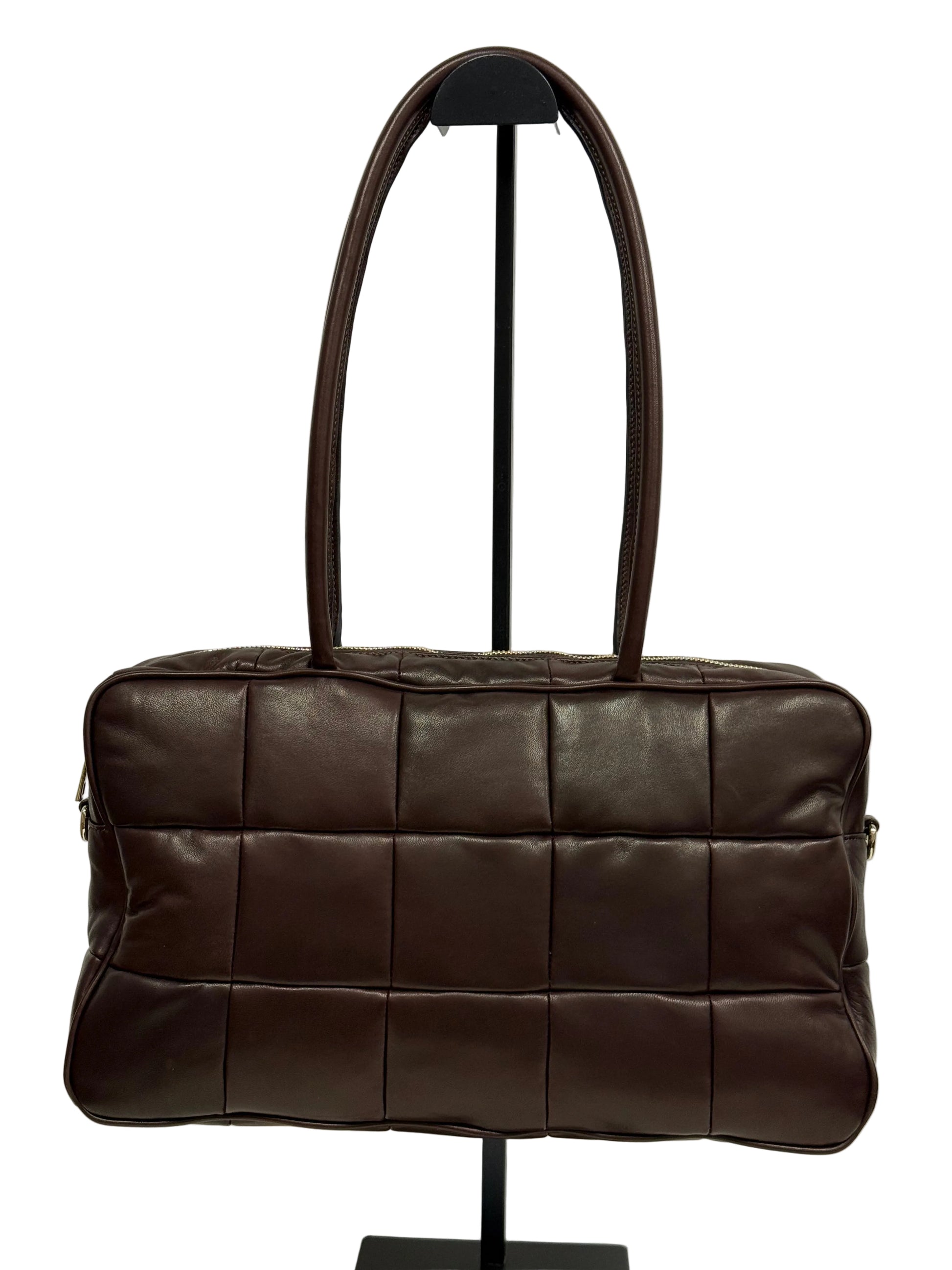 Capiente, geometrica e dal carattere deciso:questa borsa rettangolare combina linee pulite e pannelli uniti per un look moderno e funzionale. La pelle cioccolato , adatta ad ogni stagione,aggiunge personalità, mentre i manici lunghi ne fanno un accessorio pratico e distintivo, perfetto per accompagnare la quotidianità con stile.