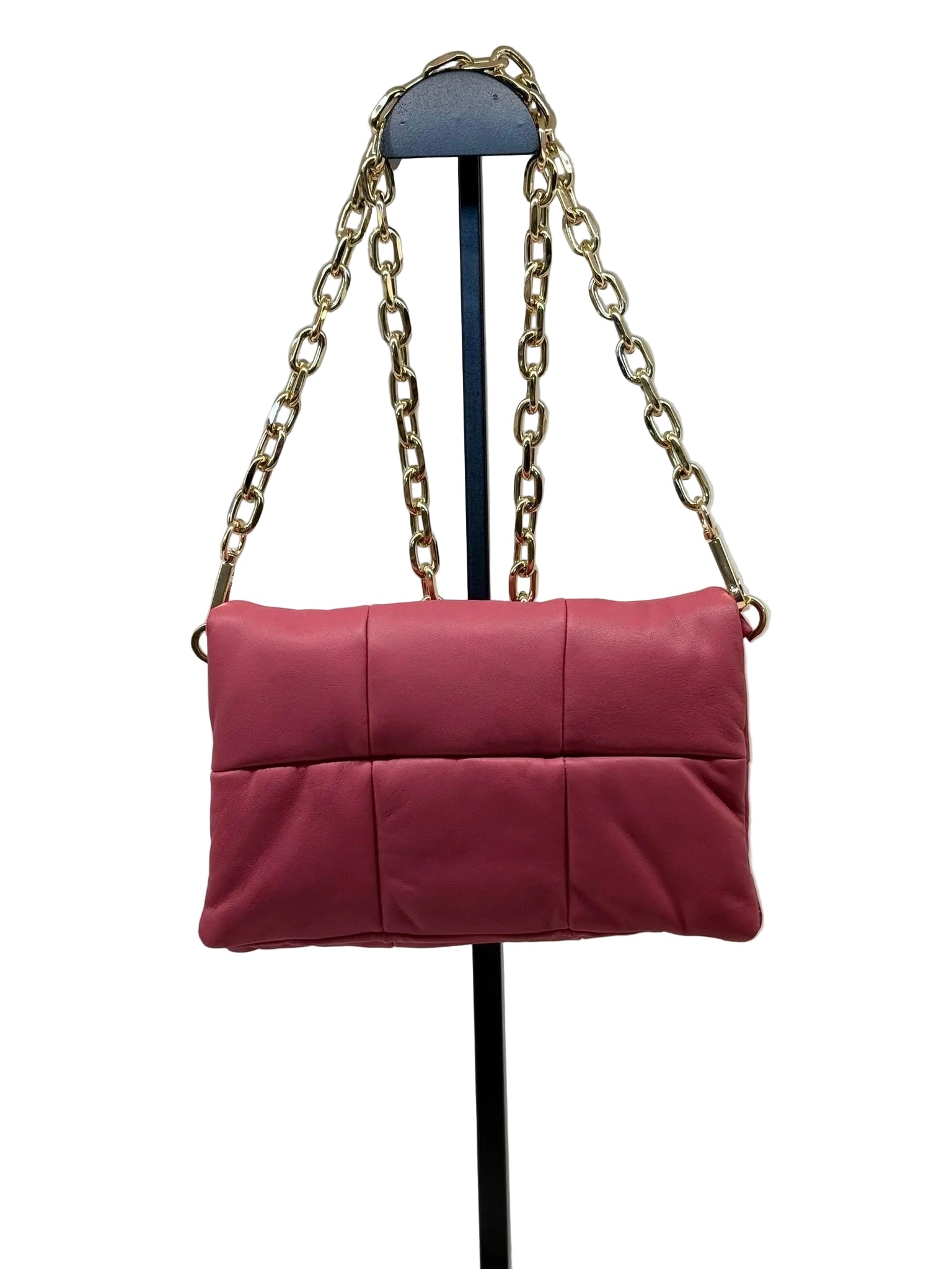Audace e femminile, il rosa intenso si unisce a una struttura a blocchi unici che cattura lo sguardo e definisce un’estetica moderna e originale. La catena dorata, robusta e luminosa, valorizza ogni dettaglio con un tocco sofisticato. Un accessorio compatto ma di carattere, ideale per aggiungere energia e stile a qualsiasi outfit, dal giorno alla sera.